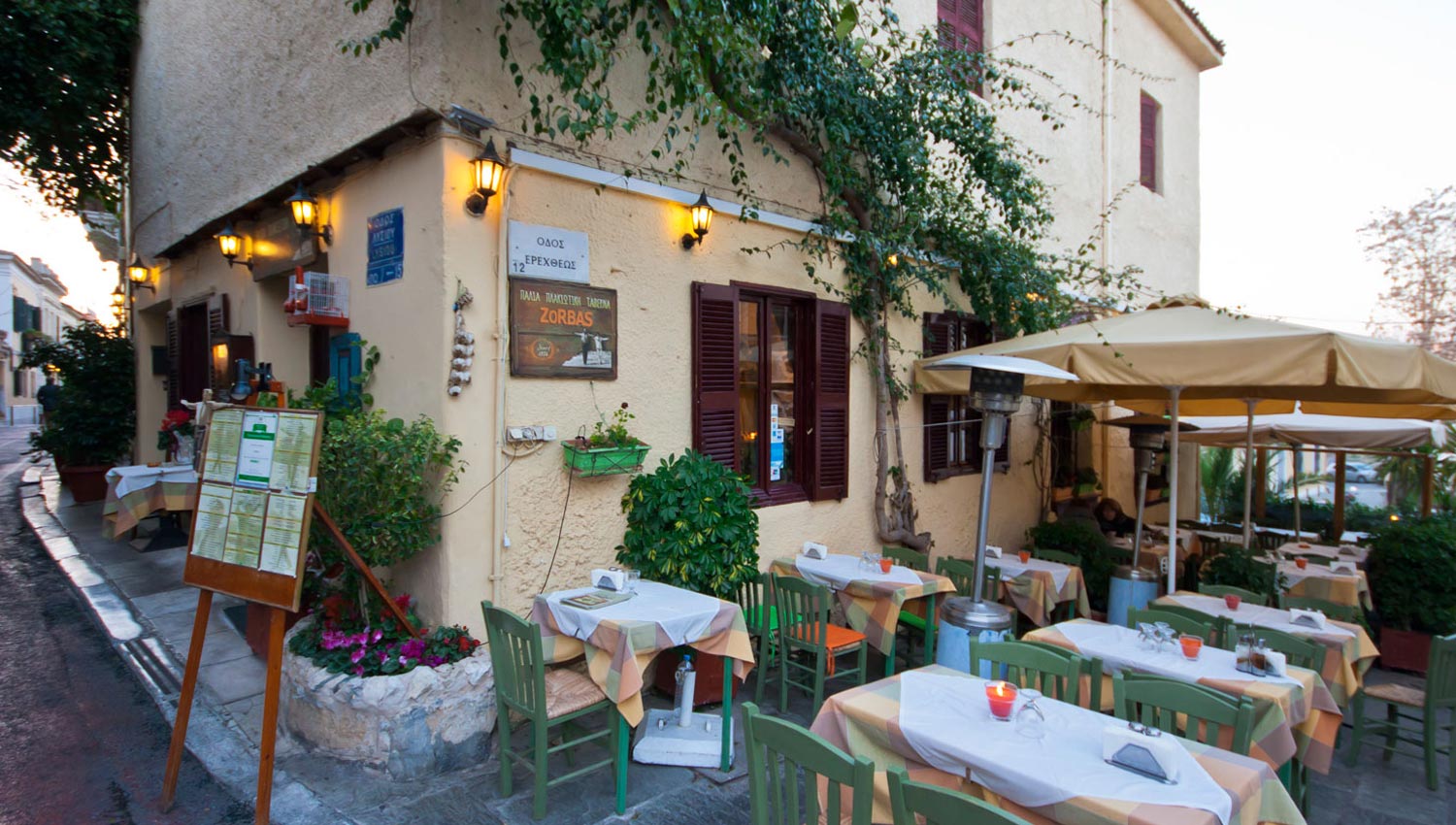 The restaurant ZORBAS is situated in the heart of Plaka (ancient town of Athens - in the neighborhood of the ancient Gods) and in the region Anafiotika.
